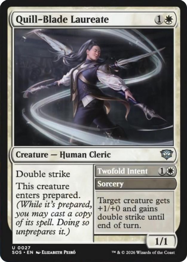 | Oracle Text | double strike this creature enters prepared. (while it's prepared, you may cast a copy of its spell. doing so unprepares it.) twofold intent 1w sorcery target creature gets +1/+0 and gains double strike until end of turn. | ||