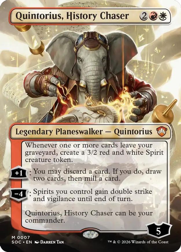 Quintorius, History Chaser (Borderless) is a Mythic Rare in the set Commander: Secrets of Strixhaven.