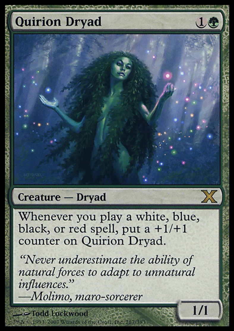 | Oracle Text | Whenever you cast a white, blue, black, or red spell, put a +1/+1 counter on Quirion Dryad. | ||