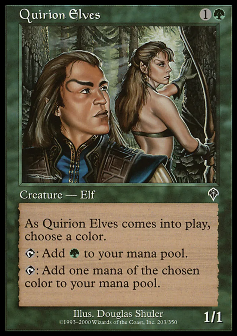 | Oracle Text | As Quirion Elves enters the battlefield, choose a color. {{t}}: Add {{g}} to your mana pool. {{t}}: Add one mana of the chosen color to your mana pool. | ||