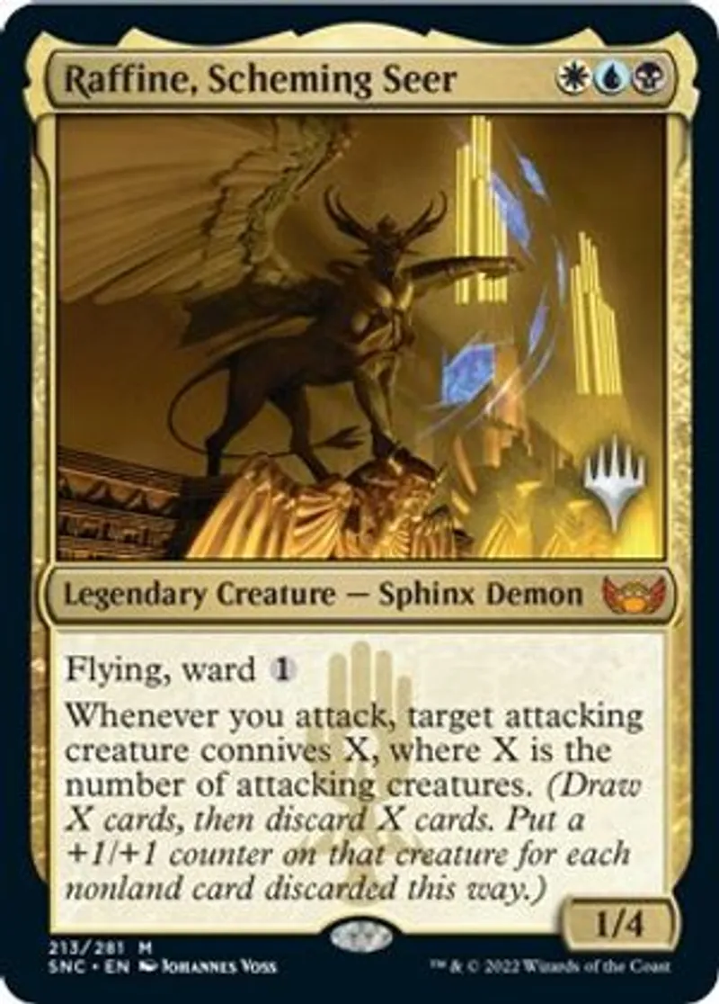 Magic: the Gathering (mtg) Mythic Rare Legendary Creature - Sphinx Demon Raffine, Scheming Seer from Promo Pack: Streets of New Capenna (PSNC) last updated 2026-02-24 15:36:36