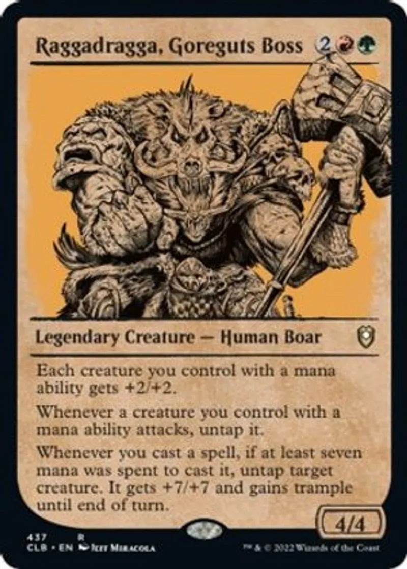 Magic: the Gathering (mtg) Rare Legendary Creature — Human Boar Raggadragga, Goreguts Boss from Commander Legends: Battle for Baldur's Gate (CLB) last updated 2026-02-21 16:07:35