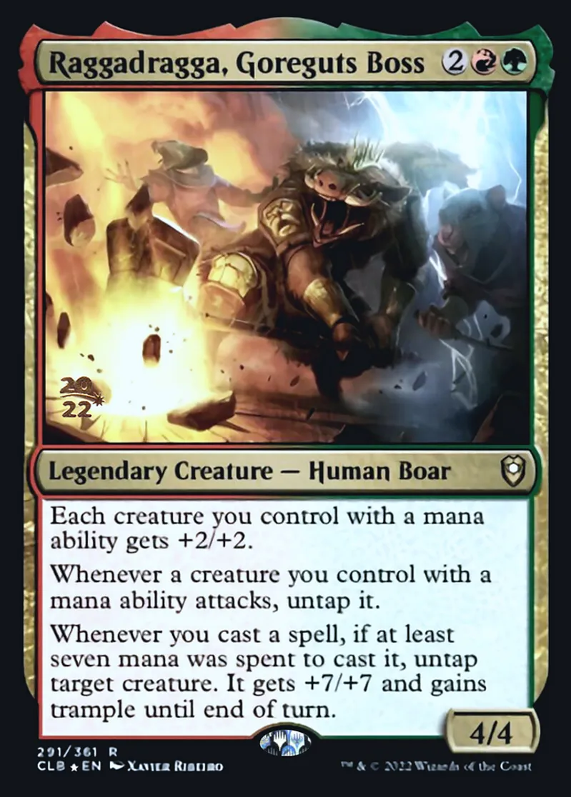 Magic: the Gathering (mtg) Rare Legendary Creature — Human Boar Raggadragga, Goreguts Boss from Prerelease Cards (pPRE) last updated 2026-02-25 15:38:06