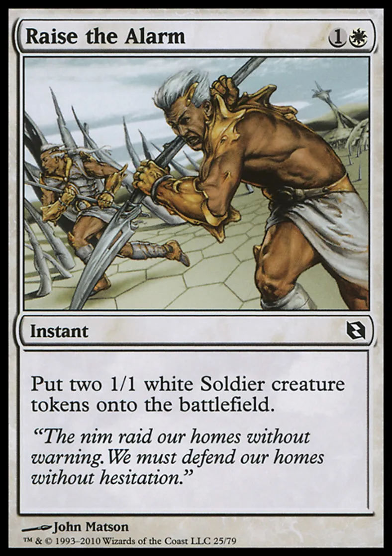 Raise the Alarm is a Common in the set Duel Decks: Elspeth vs. Tezzeret.