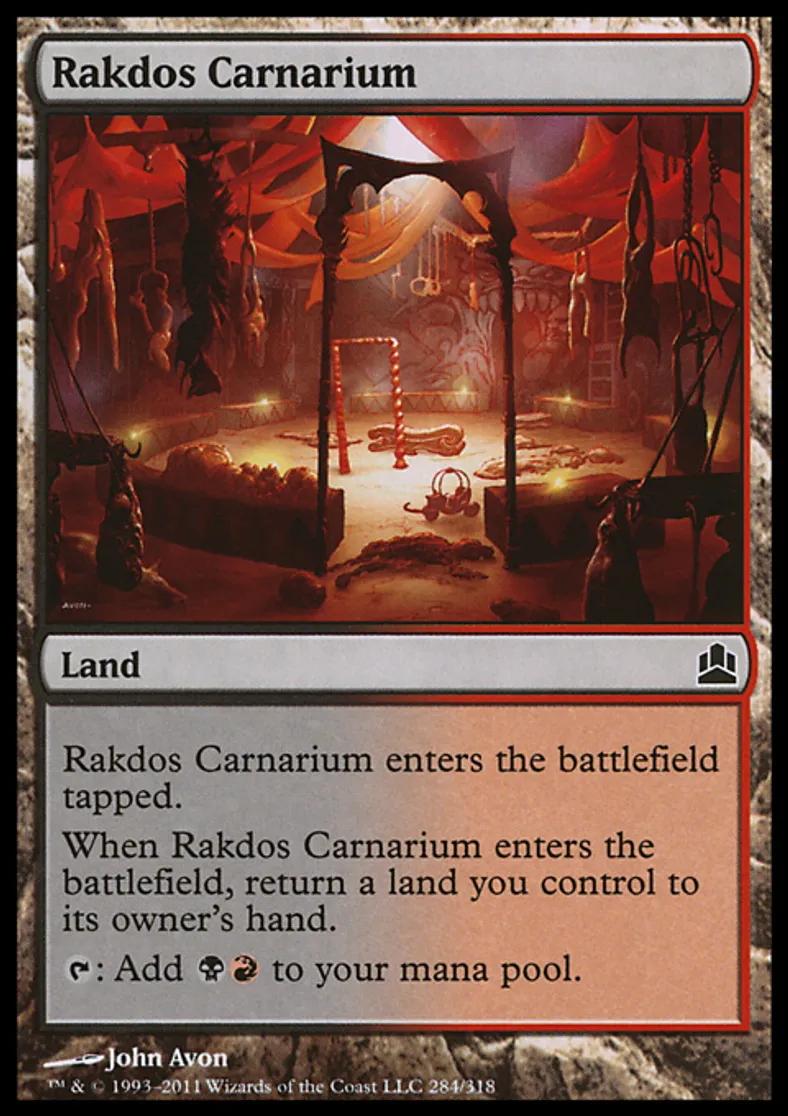 | Oracle Text | Rakdos Carnarium enters the battlefield tapped. When Rakdos Carnarium enters the battlefield, return a land you control to its owner's hand. {{t}}: Add {{b}}{{r}} to your mana pool. | ||