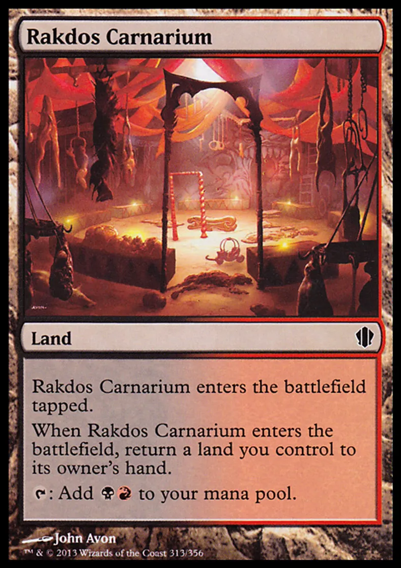 | Oracle Text | Rakdos Carnarium enters the battlefield tapped. When Rakdos Carnarium enters the battlefield, return a land you control to its owner's hand. {{t}}: Add {{b}}{{r}} to your mana pool. | ||
