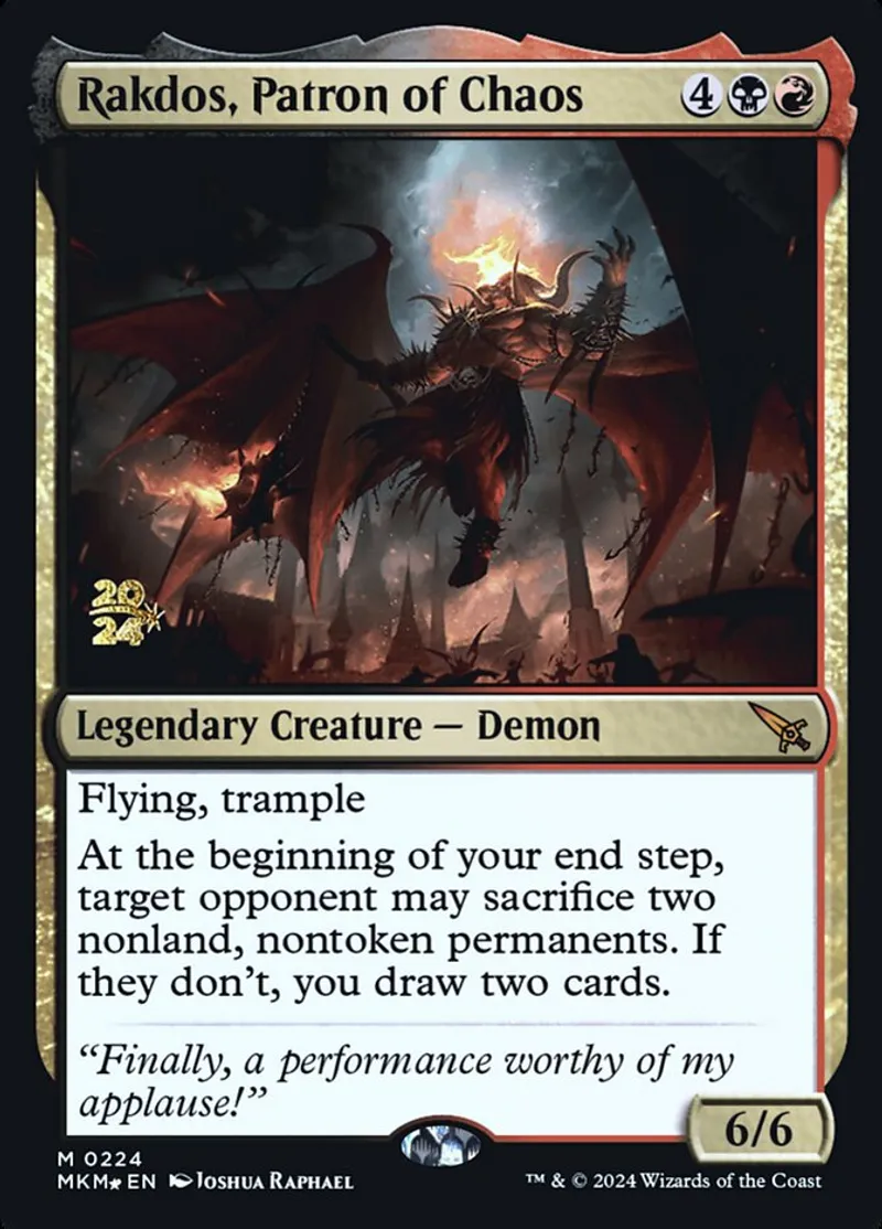 Magic: the Gathering (mtg) Mythic Rare Legendary Creature — Demon Rakdos, Patron of Chaos from Prerelease Cards (pPRE) last updated 2025-12-15 15:10:02