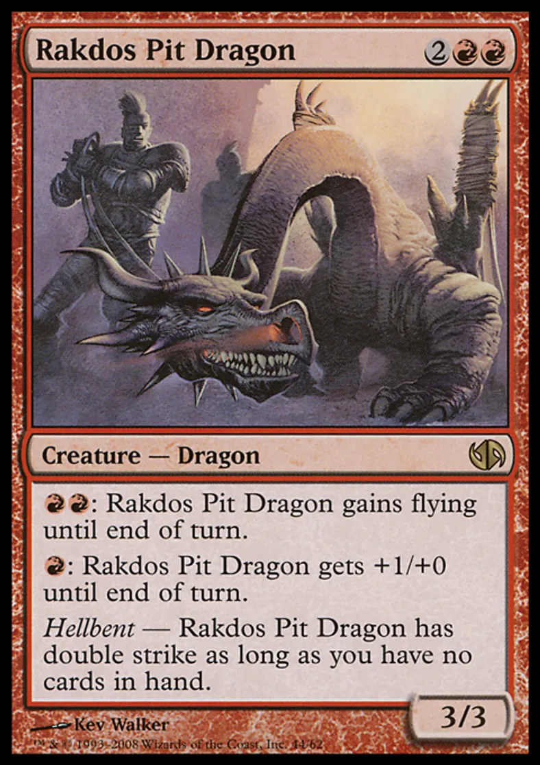 | Oracle Text | {{r}}{{r}}: Rakdos Pit Dragon gains flying until end of turn. {{r}}: Rakdos Pit Dragon gets +1/+0 until end of turn. Hellbent — Rakdos Pit Dragon has double strike as long as you have no cards in hand. | ||