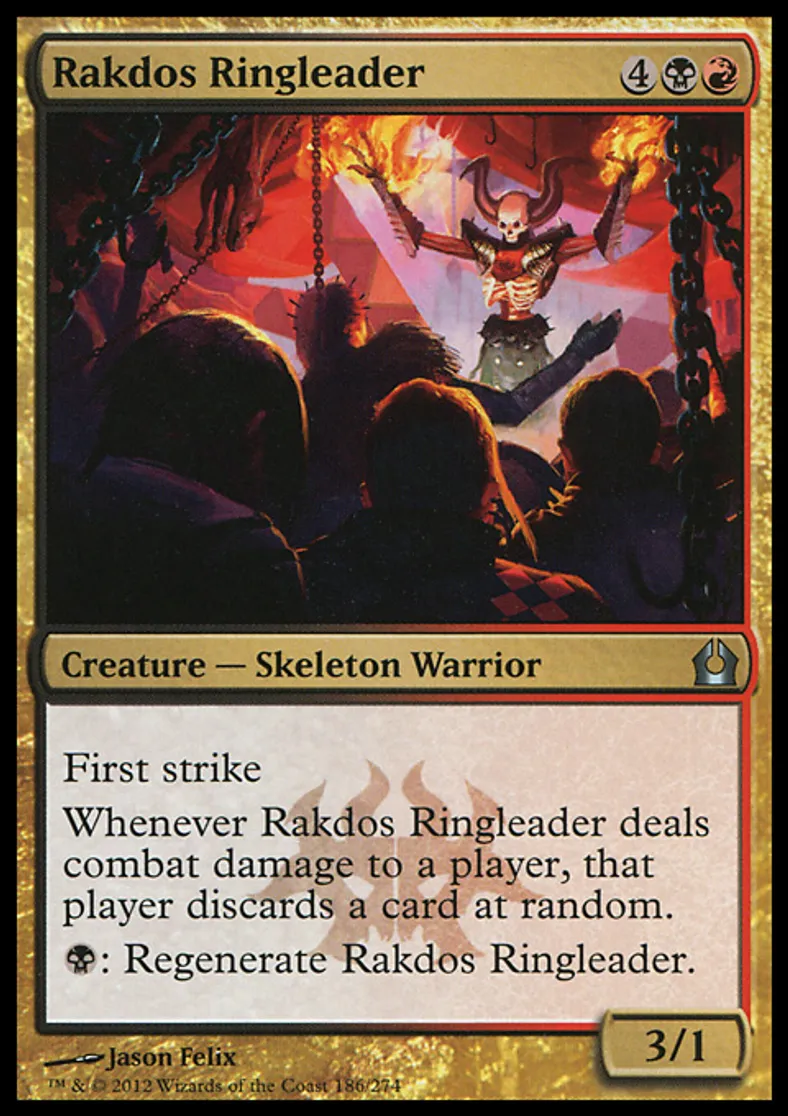 | Oracle Text | First strike Whenever Rakdos Ringleader deals combat damage to a player, that player discards a card at random. {{b}}: Regenerate Rakdos Ringleader. | ||