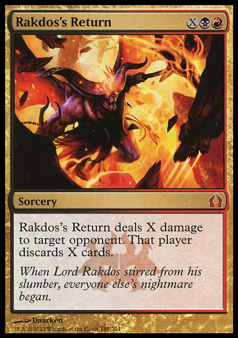 | Oracle Text | Rakdos's Return deals X damage to target opponent. That player discards X cards. | ||