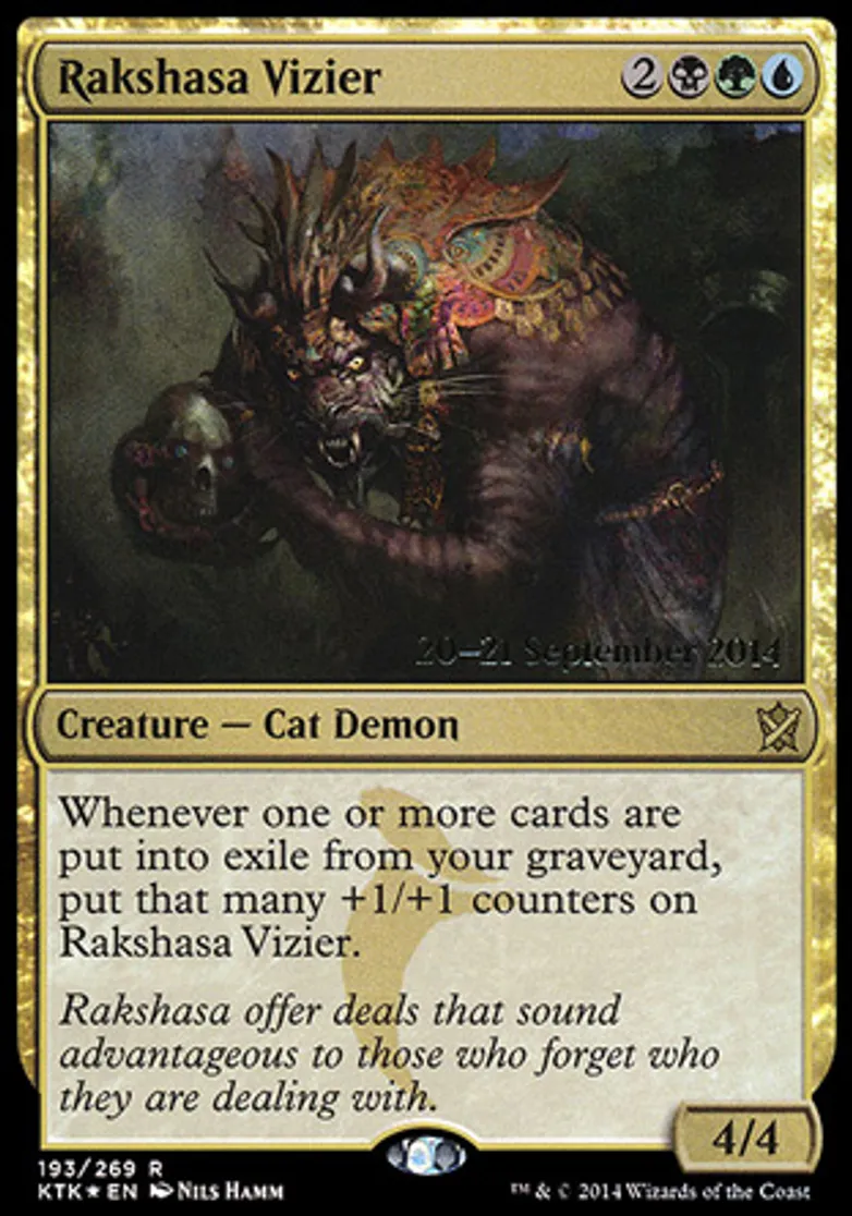 | Oracle Text | Whenever one or more cards are put into exile from your graveyard, put that many +1/+1 counters on Rakshasa Vizier. | ||