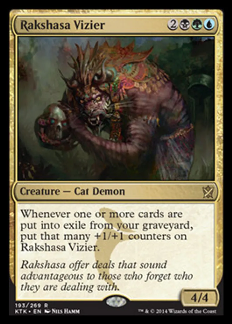 | Oracle Text | Whenever one or more cards are put into exile from your graveyard, put that many +1/+1 counters on Rakshasa Vizier. | ||