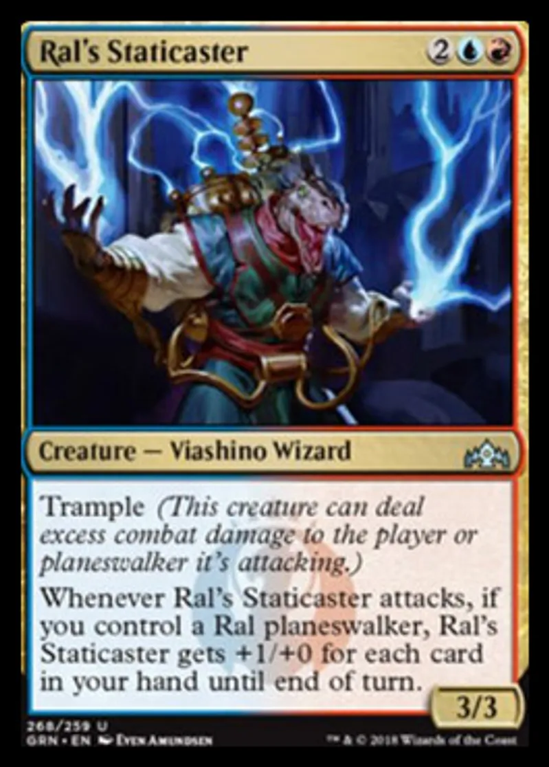 | Oracle Text | Trample (This creature can deal excess combat damage to the player or planeswalker it's attacking.) Whenever Ral's Staticaster attacks, if you control a Ral planeswalker, Ral's Staticaster gets +1/+0 for each card in your hand until end of turn. | ||