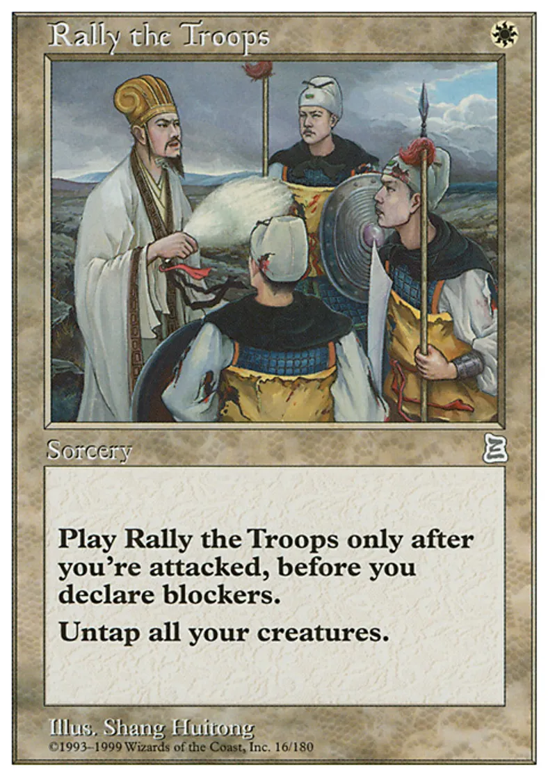 | Oracle Text | Cast Rally the Troops only during the declare attackers step and only if you've been attacked this step. Untap all creatures you control. | ||