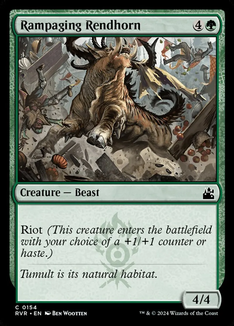 Rampaging Rendhorn is a common in the set Ravnica Remastered.