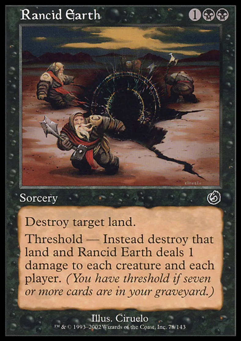 | Oracle Text | Destroy target land. Threshold — If seven or more cards are in your graveyard, instead destroy that land and Rancid Earth deals 1 damage to each creature and each player. | ||