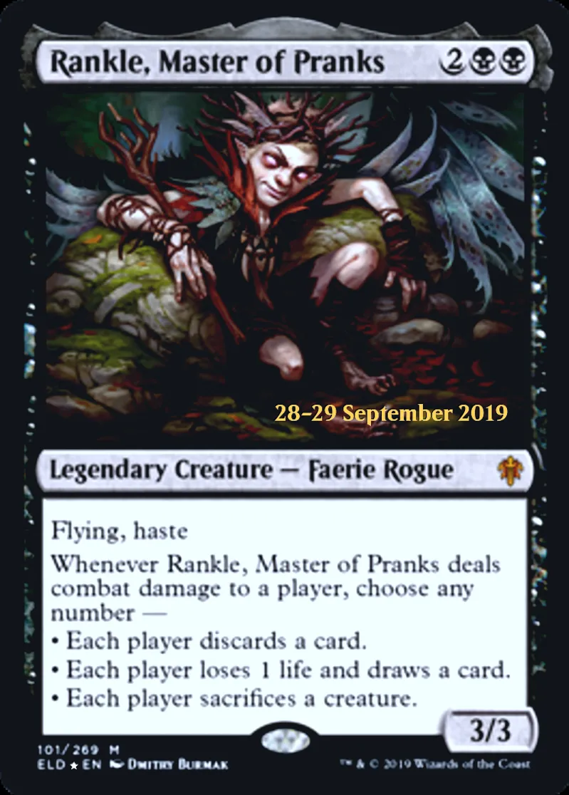 | Oracle Text | Flying, haste\r\nWhenever Rankle, Master of Pranks deals combat damage to a player, choose any number —\r\n• Each player discards a card.\r\n• Each player loses 1 life and draws a card.\r\n• Each player sacrifices a creature. | ||