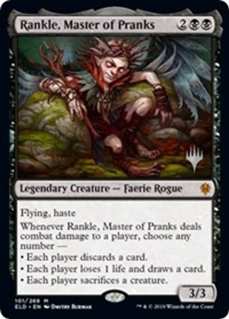Magic: the Gathering (mtg) Mythic Rare Legendary Creature — Faerie Rogue Rankle, Master of Pranks from Promo Pack: Throne of Eldraine (pELD) last updated 2026-02-24 15:25:32