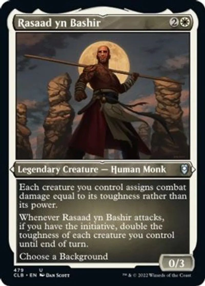 Whenever Rasaad yn Bashir attacks, if you have the initiative, double the toughness of each creature you control until end of turn.