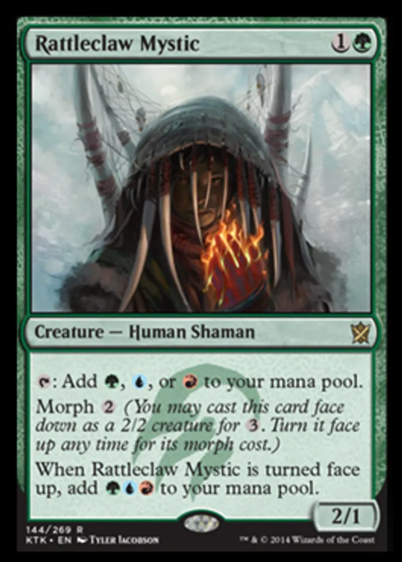 | Oracle Text | {{t}}: Add {{g}}, {{u}}, or {{r}} to your mana pool. Morph {{2}} (You may cast this card face down as a 2/2 creature for {{3}}. Turn it face up any time for its morph cost.) When Rattleclaw Mystic is turned face up, add {{g}}{{u}}{{r}} to your mana pool. | ||