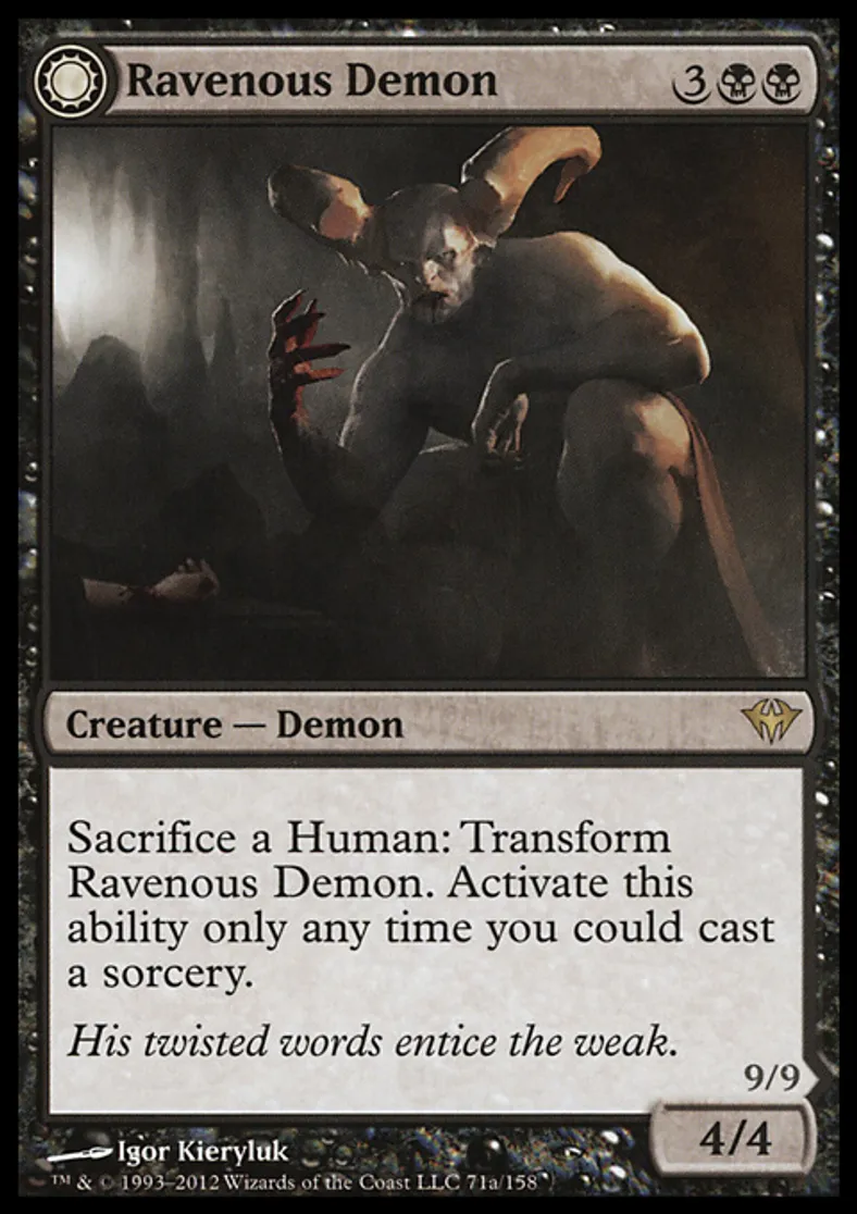 | Oracle Text | Sacrifice a Human: Transform Ravenous Demon. Activate this ability only any time you could cast a sorcery. | ||