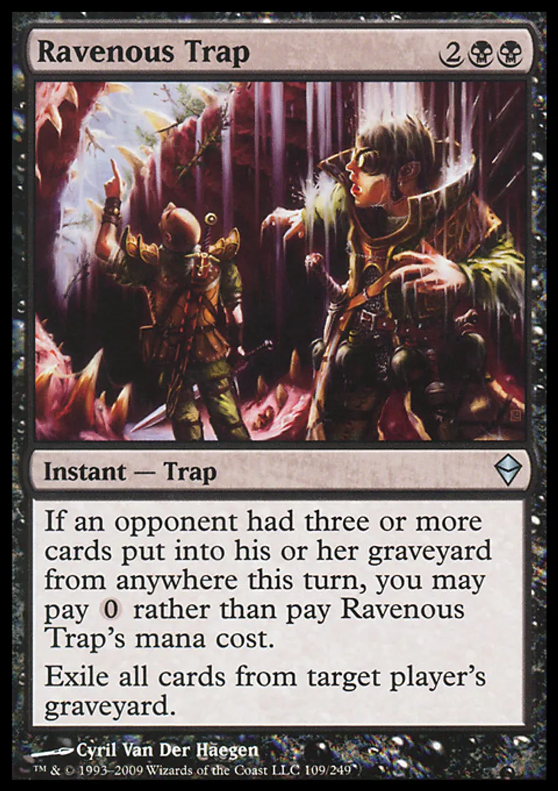 | Oracle Text | If an opponent had three or more cards put into his or her graveyard from anywhere this turn, you may pay {{0}} rather than pay Ravenous Trap's mana cost. Exile all cards from target player's graveyard. | ||