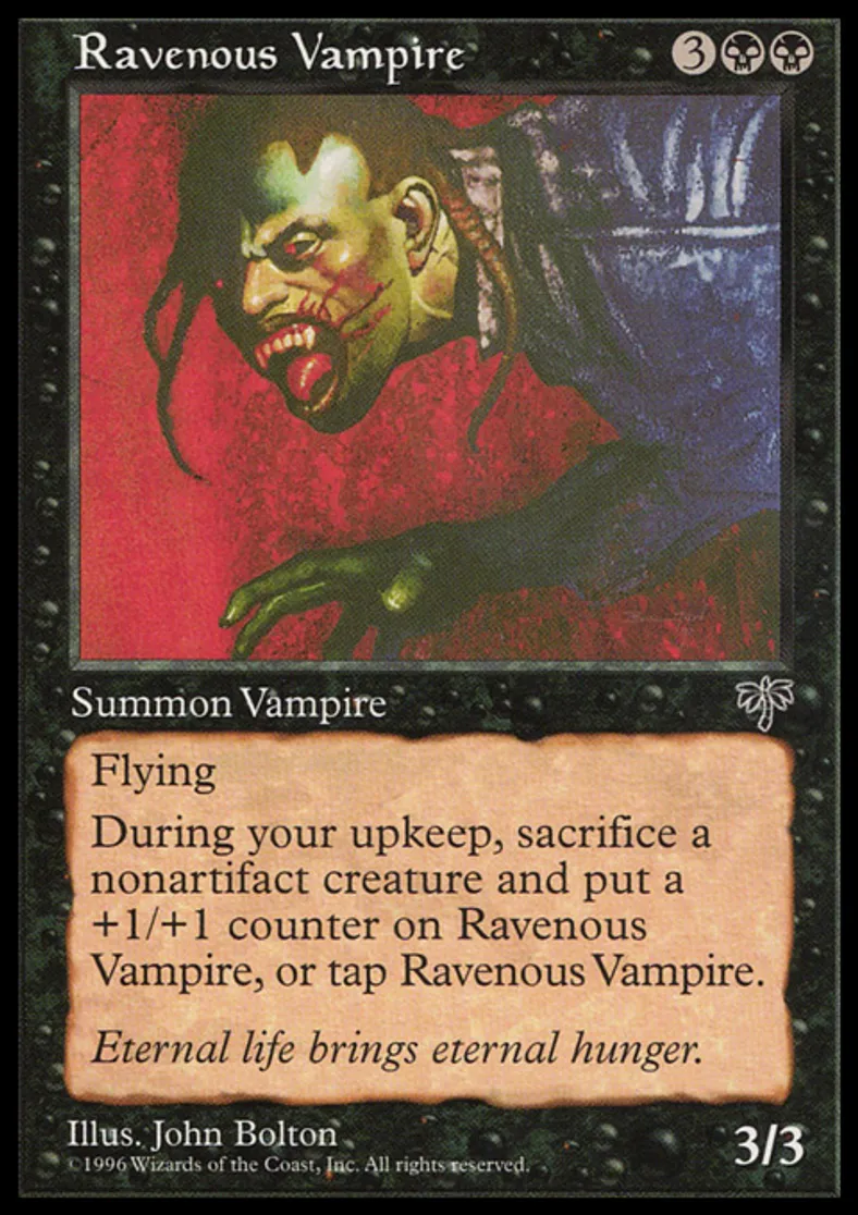 | Oracle Text | Flying At the beginning of your upkeep, you may sacrifice a nonartifact creature. If you do, put a +1/+1 counter on Ravenous Vampire. If you don't, tap Ravenous Vampire. | ||