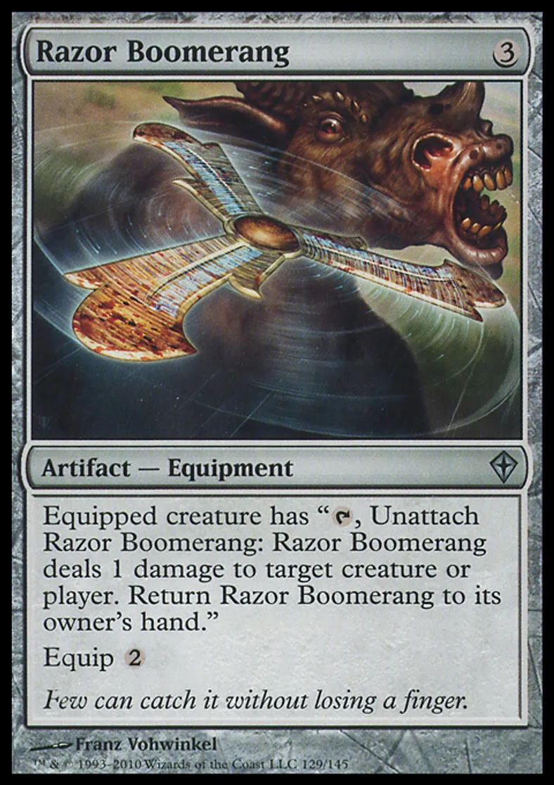 | Oracle Text | Equipped creature has "{{t}}, Unattach Razor Boomerang: Razor Boomerang deals 1 damage to target creature or player. Return Razor Boomerang to its owner's hand." Equip {{2}} | ||