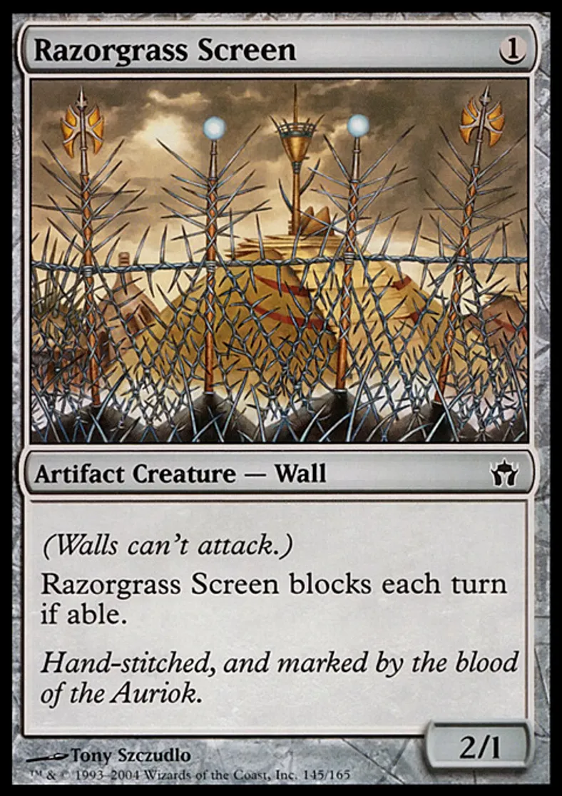 | Oracle Text | Defender (This creature can't attack.) Razorgrass Screen blocks each turn if able. | ||