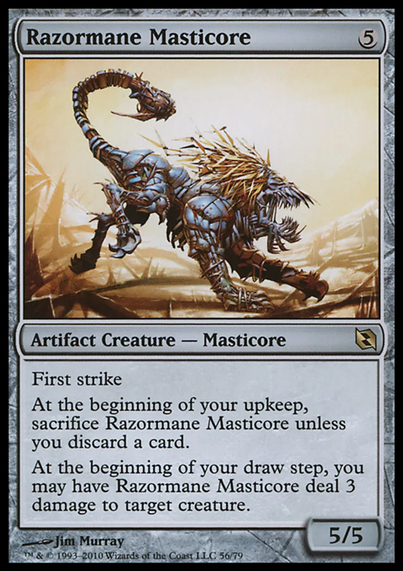 | Oracle Text | First strike (This creature deals combat damage before creatures without first strike.) At the beginning of your upkeep, sacrifice Razormane Masticore unless you discard a card. At the beginning of your draw step, you may have Razormane Masticore deal 3 damage to target creature. | ||