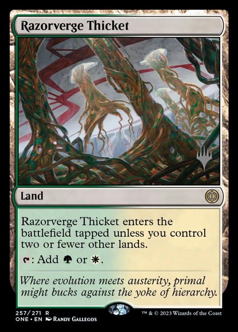 Magic: the Gathering (mtg) Rare Land Razorverge Thicket from Promo Pack: Phyrexian: All Will Be One (pONE) last updated 2026-02-24 14:56:32