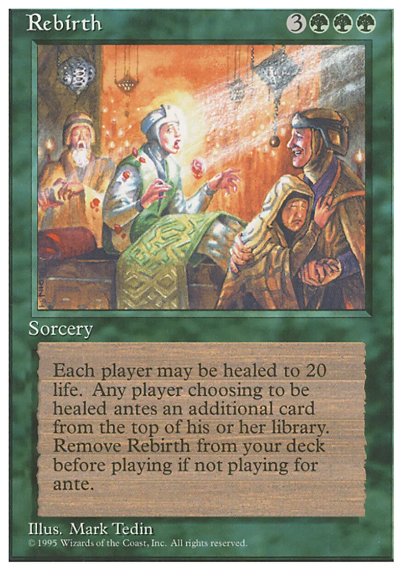 | Oracle Text | Remove Rebirth from your deck before playing if you're not playing for ante. Each player may put the top card of his or her library into the ante. If a player does, his or her life total becomes 20. | ||