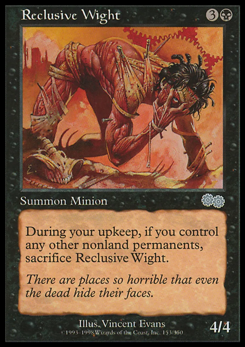 | Oracle Text | At the beginning of your upkeep, if you control another nonland permanent, sacrifice Reclusive Wight. | ||