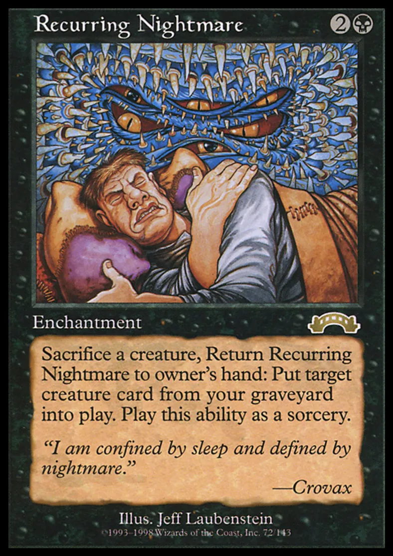 | Oracle Text | Sacrifice a creature, Return Recurring Nightmare to its owner's hand: Return target creature card from your graveyard to the battlefield. Activate this ability only any time you could cast a sorcery. | ||