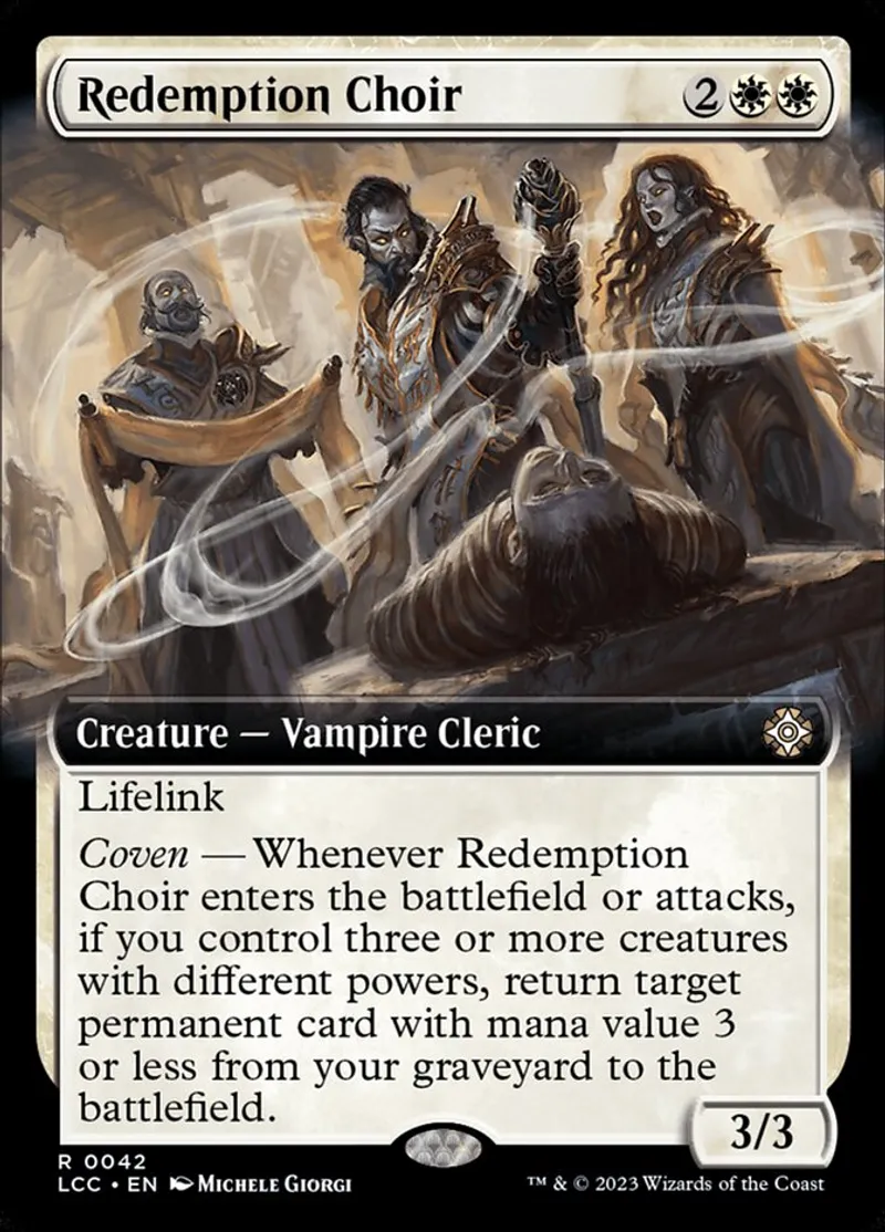 Coven — Whenever Redemption Choir enters the battlefield or attacks, if you control three or more creatures with different powers, return target permanent card with mana value 3 or less from your graveyard to the battlefield. | ||