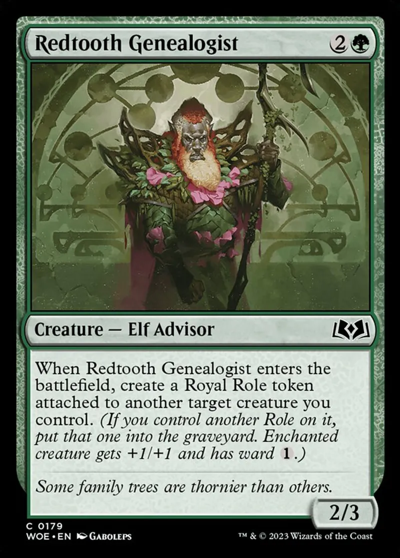 | Oracle Text | When Redtooth Genealogist enters the battlefield, create a Royal Role token attached to another target creature you control. (If you control another Role on it, put that one into the graveyard. Enchanted creature gets +1/+1 and has ward {1}.) | ||