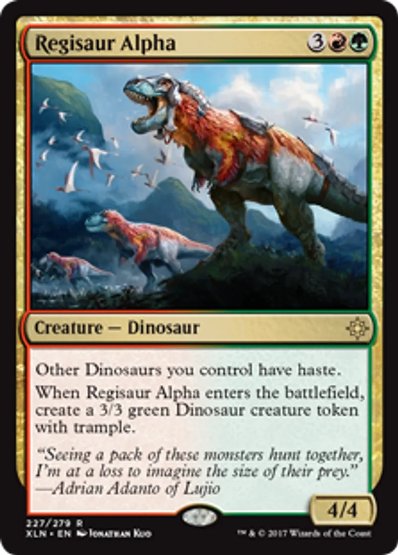 | Oracle Text | Other Dinosaurs you control have haste. When Regisaur Alpha enters the battlefield, create a 3/3 green Dinosaur creature token with trample. | ||