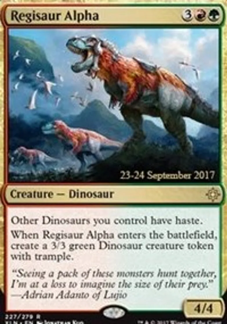 | Oracle Text | Other Dinosaurs you control have haste.\r\nWhen Regisaur Alpha enters the battlefield, create a 3/3 green Dinosaur creature token with trample. | ||