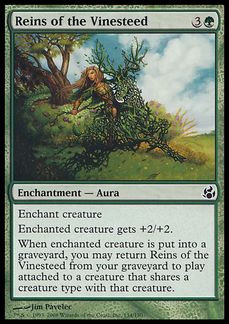 | Oracle Text | Enchant creature Enchanted creature gets +2/+2. When enchanted creature dies, you may return Reins of the Vinesteed from your graveyard to the battlefield attached to a creature that shares a creature type with that creature. | ||