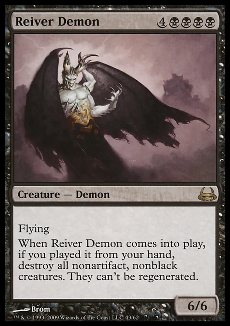 | Oracle Text | Flying When Reiver Demon enters the battlefield, if you cast it from your hand, destroy all nonartifact, nonblack creatures. They can't be regenerated. | ||
