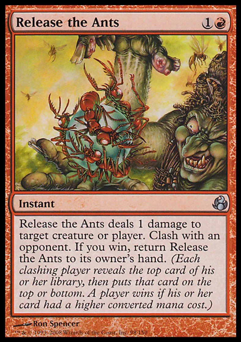 | Oracle Text | Release the Ants deals 1 damage to target creature or player. Clash with an opponent. If you win, return Release the Ants to its owner's hand. (Each clashing player reveals the top card of his or her library, then puts that card on the top or bottom. A player wins if his or her card had a higher converted mana cost.) | ||