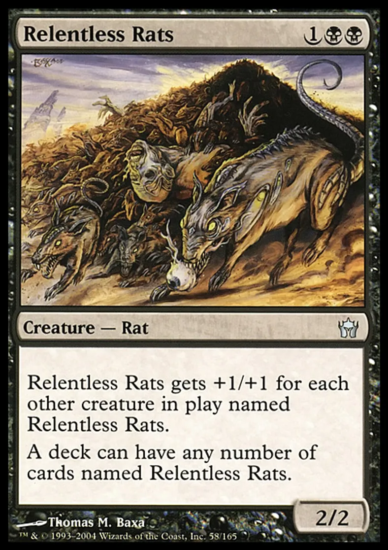 | Oracle Text | Relentless Rats gets +1/+1 for each other creature on the battlefield named Relentless Rats. A deck can have any number of cards named Relentless Rats. | ||
