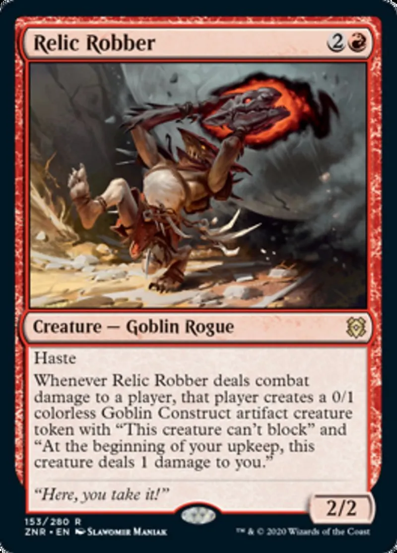Whenever Relic Robber deals combat damage to a player, that player creates a 0/1 colorless Goblin Construct artifact creature token with "This creature can't block" and "At the beginning of your upkeep, this creature deals 1 damage to you." | ||