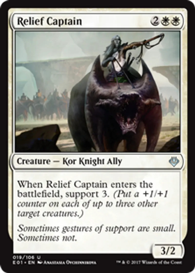 | Oracle Text | When Relief Captain enters the battlefield, support 3. (Put a +1/+1 counter on each of up to three other target creatures.) | ||