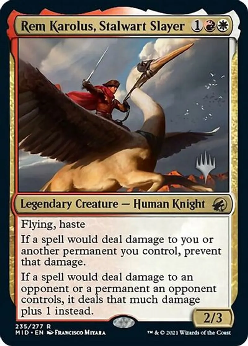 Magic: the Gathering (mtg) Rare Legendary Creature - Human Knight Rem Karolus, Stalwart Slayer from Promo Pack: Innistrad: Midnight Hunt (pMID) last updated 2026-02-21 16:42:36