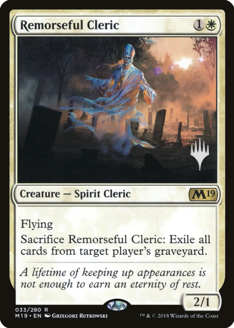 | Oracle Text | Flying\r\nSacrifice Remorseful Cleric: Exile all cards from target player\'s graveyard. | ||