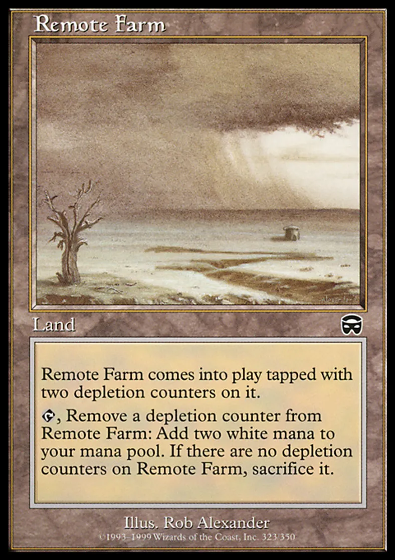| Oracle Text | Remote Farm enters the battlefield tapped with two depletion counters on it. {{t}}, Remove a depletion counter from Remote Farm: Add {{w}}{{w}} to your mana pool. If there are no depletion counters on Remote Farm, sacrifice it. | ||