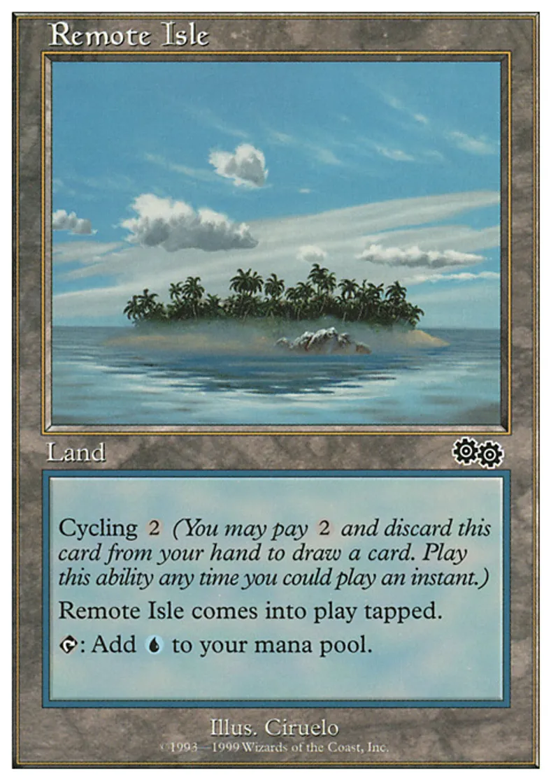 | Oracle Text | Remote Isle enters the battlefield tapped. {{t}}: Add {{u}} to your mana pool. Cycling {{2}} ({{2}}, Discard this card: Draw a card.) | ||