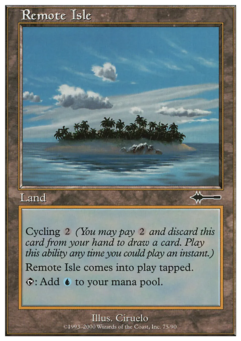 | Oracle Text | Remote Isle enters the battlefield tapped. {{t}}: Add {{u}} to your mana pool. Cycling {{2}} ({{2}}, Discard this card: Draw a card.) | ||
