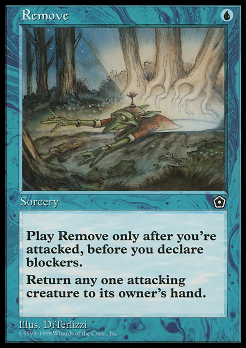 | Oracle Text | Cast Remove only during the declare attackers step and only if you've been attacked this step. Return target attacking creature to its owner's hand. | ||